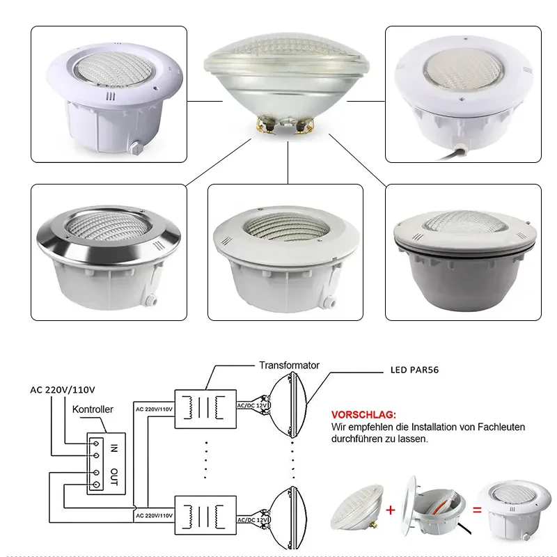 Upgrade your pool lighting with our high-quality LED PAR56 pool lights. Designed to replace traditional halogen PAR56 bulbs, these energy-efficient LED lights provide bright, vibrant illumination while fitting your existing pool housing. Available in single colors (Warm White, Cool White, Blue) or RGB multicolor with remote control for customizable lighting effects.